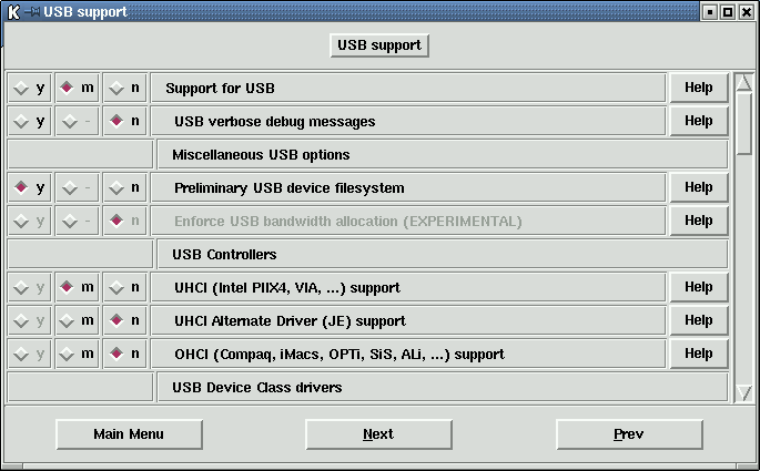 Simply enabling your motherboard's USB ports in not enough, you need to specify also the drivers (modules) of the USB equipment that is connected to your computer. The list that comes up under 'USB Device Class drivers' has the various choices. All this is rather straightforward and little can go wrong: still, in case of doubt read the help texts.